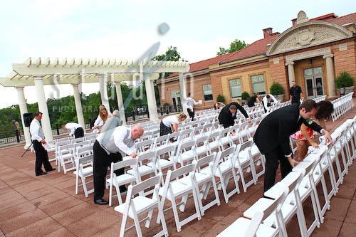 Right before the ceremony the sky opened up and let loose its fury. Usually this is not a problem, but Jon and Lisa were having an outdoor wedding. Luckily it stopped long enough for the bridal party and several others to towel off the chairs.