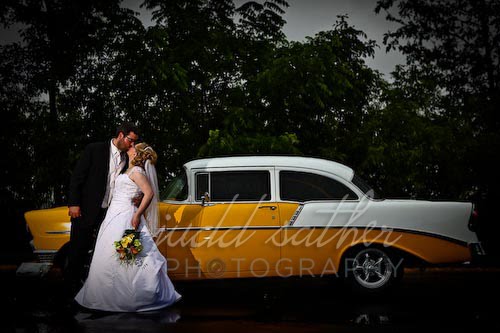 With all this rain you’d think our lakes would fill back up! Actually it was just kind of a light rain but it lasted almost all day. Doug and Taryn are super laid back and both have great laughs – amazing qualities for a happy life together. Doug really loosened up when we grabbed some images with the bridesmaids. Right Dougy? Taryn, aka “Peanut” and her dad, aka “Pops” had an emotional first sighting – I always love the access we have as photographers to get a front row seat to these events. Pops had this sweet yellow ’56 Chevy all decked out with his “newlyweds on board” yellow caution sign. The old el Camino was a sweet ride too… love the black and white of it below.